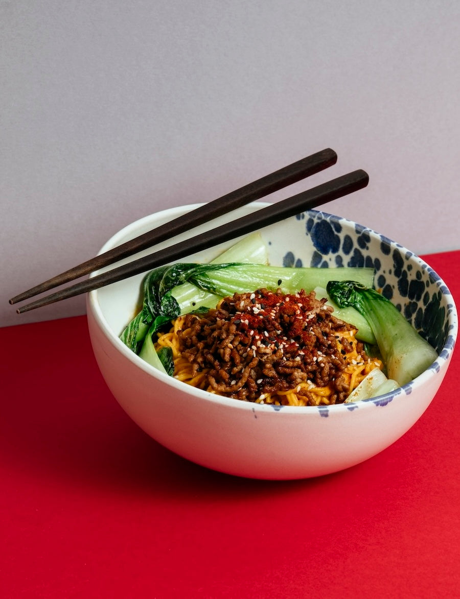For a classic bowl of Dan Dan Noods, get ±30g pork mince, spring onions, crushed peanuts, Sichuan pepper flakes, and if you’re a pro - Sui Mi Ya Cai (preserved mustard greens).